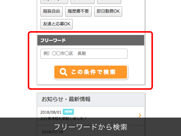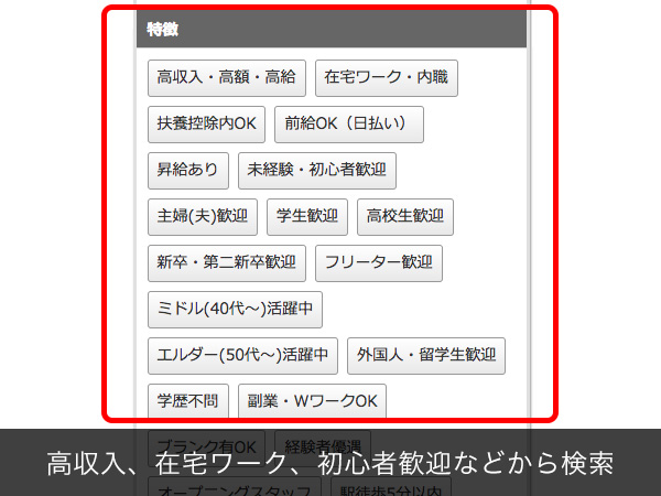 下記のような、数多くの選択肢と使いやすい画面により、「場所」「勤務形態」「特徴」「フリーワード」を検索することができるので、自分が探している仕事がすぐに見つかります!